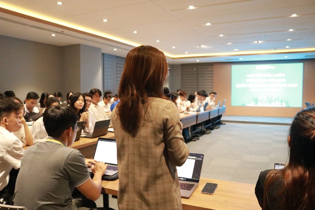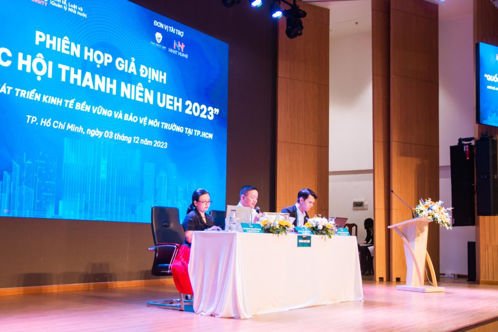 Phiên thảo luận tổ được tổ chức vào tối ngày 27/11/2023 trực tiếp tại phòng hội nghị B1.205, số 279 đường Nguyễn Tri Phương với 120 đại biểu đến từ 16 Đoàn đại biểu và Ban cố vấn chuyên môn bao gồm ThS. Nguyễn Thị Thương Nhớ – Bí thư Đoàn UEH, Bí thư Ban cán sự Đoàn CELG, Trưởng ban tổ chức chương trình và ThS. Mai Nguyễn Dũng, UV BTV Đoàn UEH, Trưởng Ban Học tập – NCKH – QHQT Đoàn UEH, Bí thư khoa Luật. Trong phiên thảo luận tổ, lần lượt 16 đoàn đại biểu trình bày các ý kiến tham luận của mình trong vòng tối đa 04 phút, sau đó tiếp nhận và trả lời những ý kiến thảo luận từ các đoàn đại biểu khác. Từ đó, với hơn 30 vấn đề được đặt ra, Hội đồng ban cố vấn đã góp ý, đưa ra những đề xuất phát triển, khai thác sâu hơn về những vấn đề liên quan đến phát triển kinh tế bền vững và bảo vệ môi trường tại TP. Hồ Chí Minh hiện nay. Sau phiên thảo luận tổ, các đoàn đại biểu tiếp thu những góp ý, đề xuất và phát triển nội dung của đơn vị. Và đã tóm gọn thành những nhóm vấn đề chính sau: