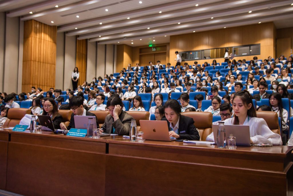 Phiên họp chính thức được chia thành 2 phiên họp sáng và chiều ngày 03/12/2023 tại hội trường B1.302 với sự tham gia đầy đủ của 137 đại biểu, gần 200 sinh viên dự thính, Ban cố vấn chuyên môn và Ban tổ chức. Trong đó, thành phần Ban cố vấn chuyên môn bao gồm các thầy cô nhiều kinh nghiệm từ các khoa khác nhau trong vai Đoàn Chủ tịch giả định để đảm bảo có thể bao quát hết các lĩnh vực được trình bày: